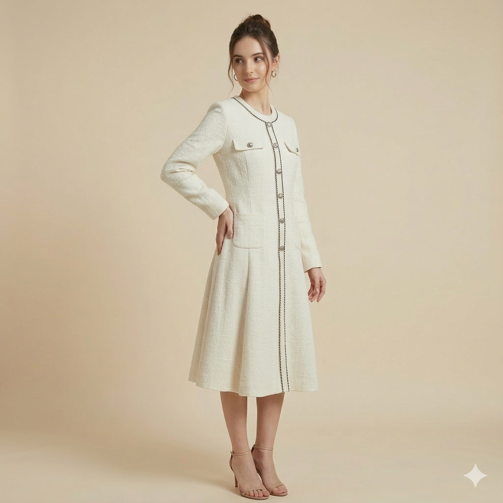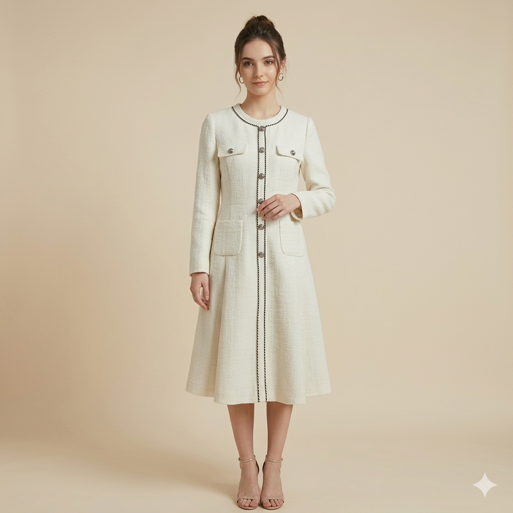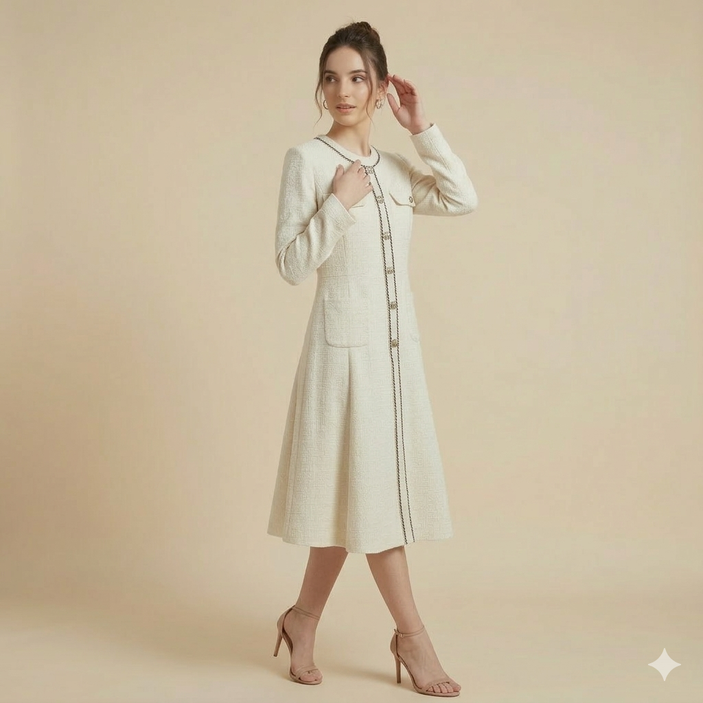 Inspired by vintage Parisian couture, this cream bouclé tweed dress exuded effortless sophistication. The dress is defined by its meticulous black braided trim along the jewel neckline and central placket, creating a striking contrast that draws the eye.