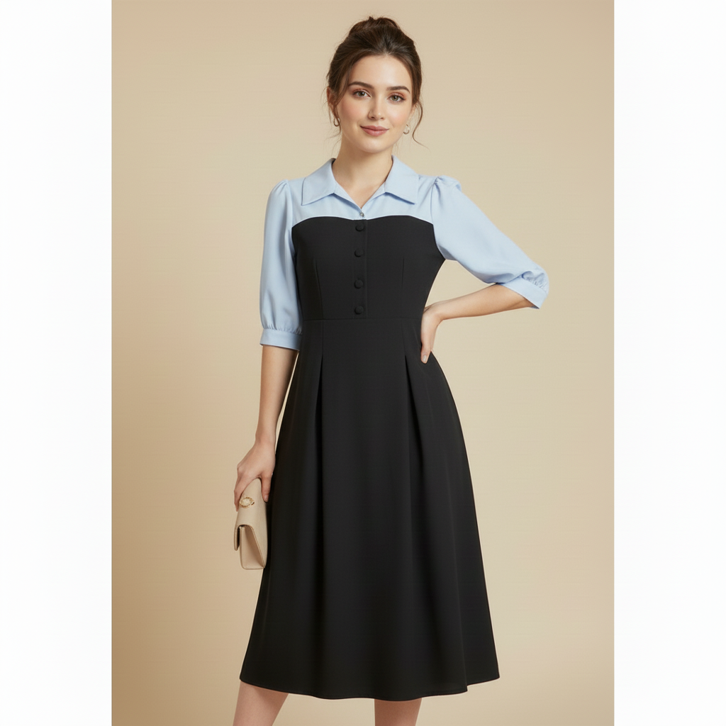 This striking contrast dress creates a flawless faux-layered aesthetic, mimicking a perfectly tucked light blue blouse under a tailored black dress. The top features a classic pointed collar and feminine half-length puff sleeves, providing a bright, clean frame for the face.