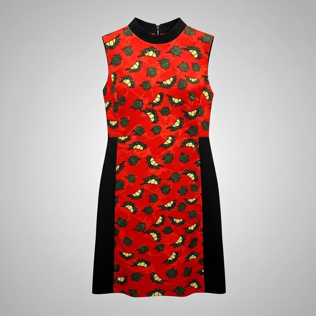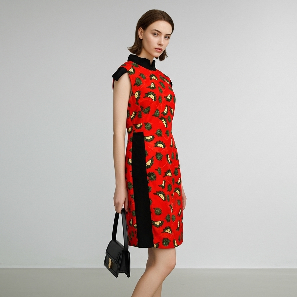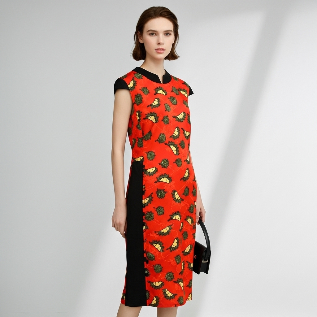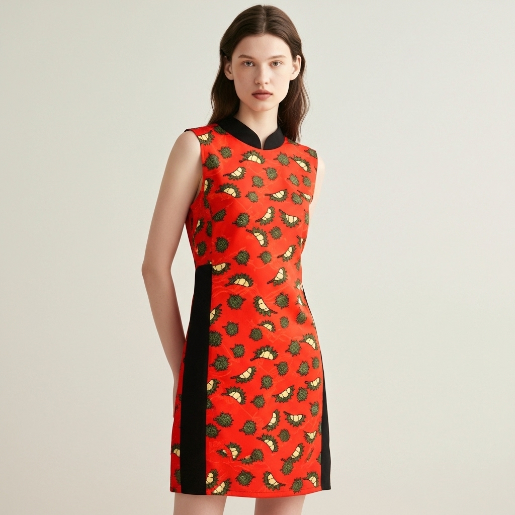 Product Details: Make a bold statement with this vibrant red cheongsam featuring a unique Singaporean “King of Fruits” (Durian) motif. The playful green durian print contrasts beautifully against the bright red fabric, creating a look that is both traditional and fun.