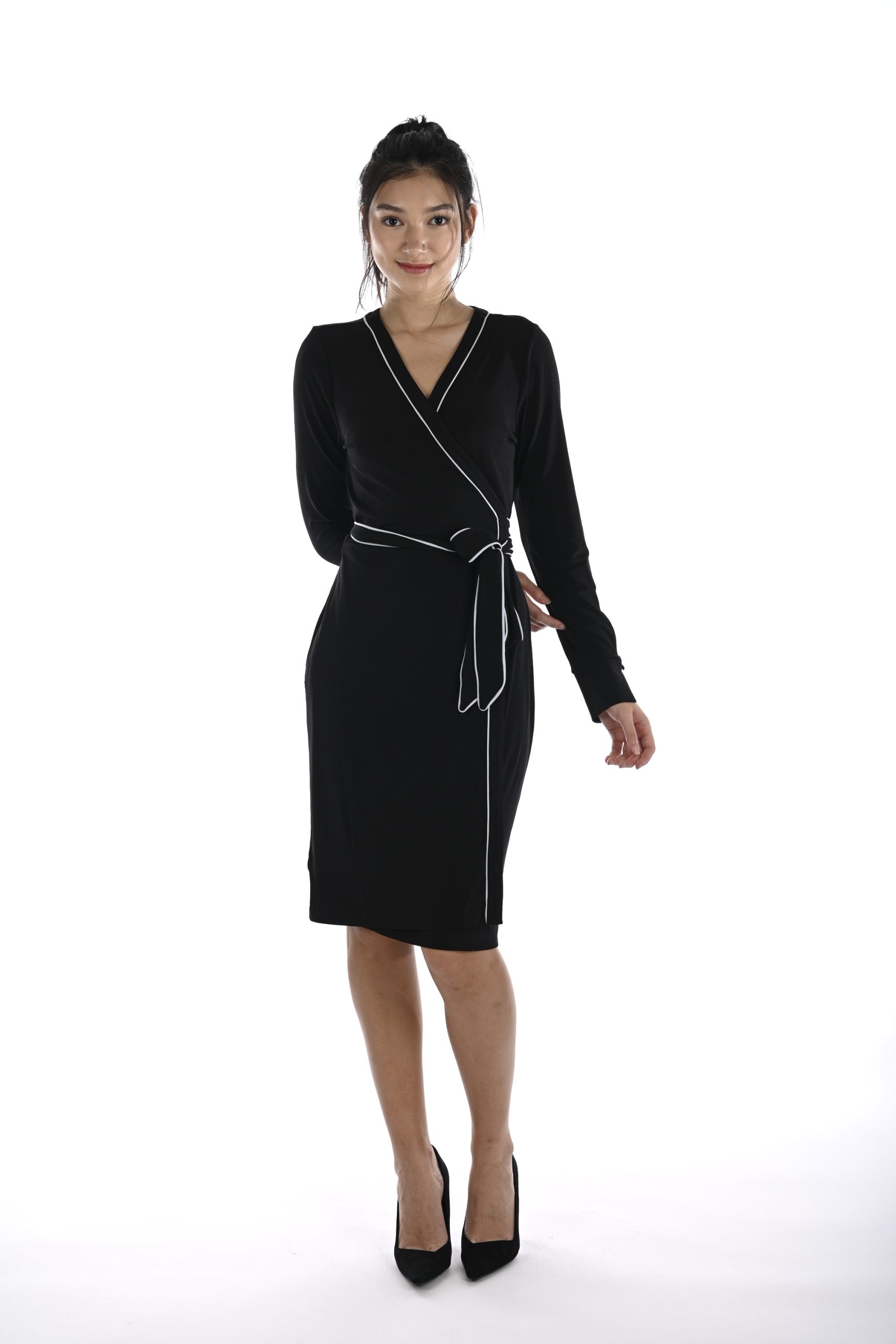 A TASI NEWYORK wrap dress with white contrast trim and a tie – waist. The long sleeves and body – skimming fit create a sleek, sophisticated silhouette for office or evening wear.