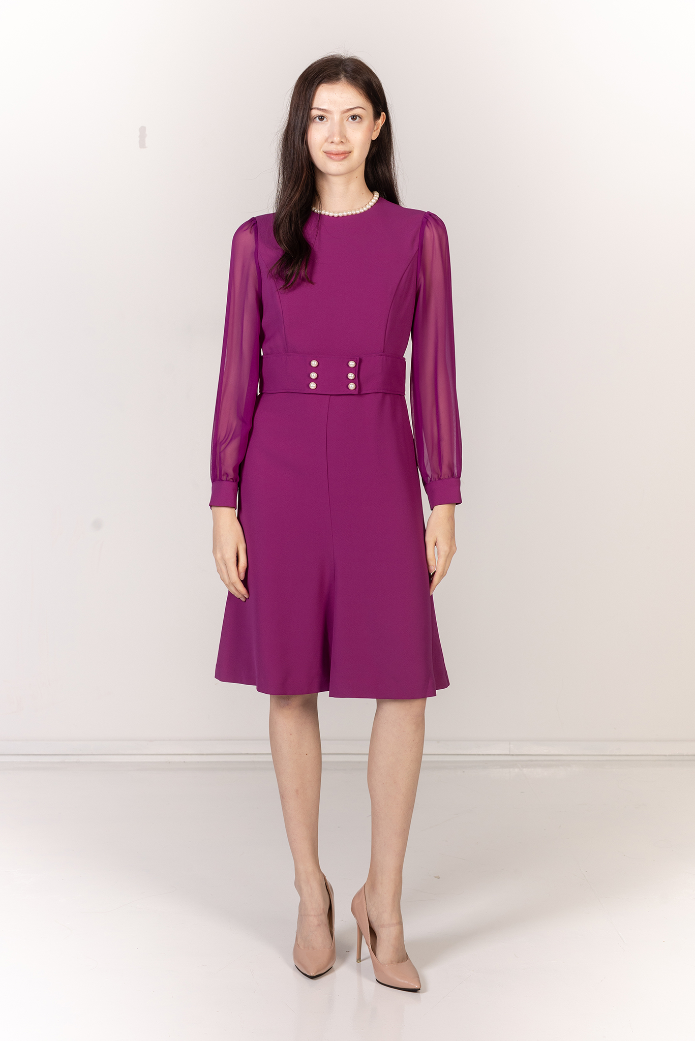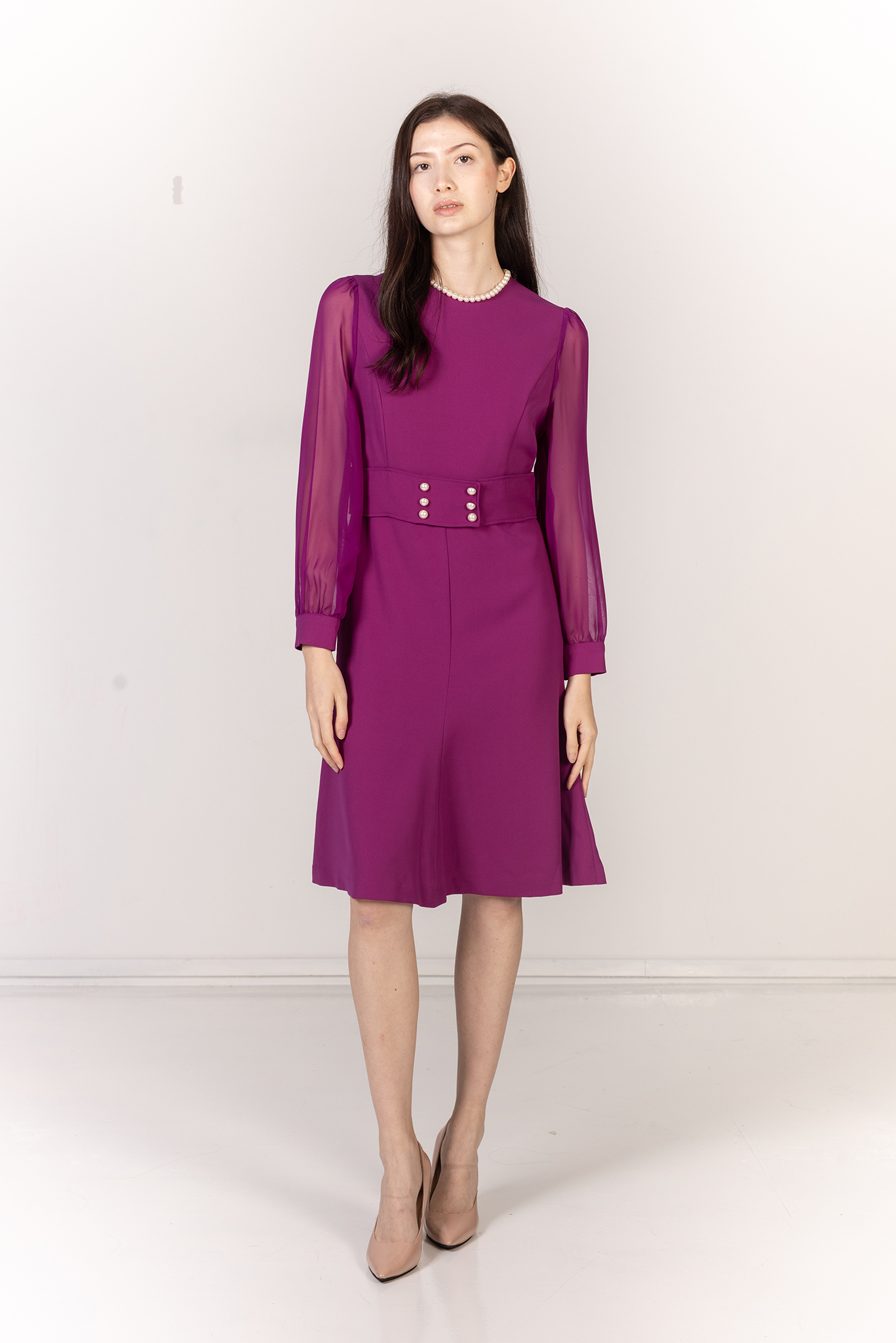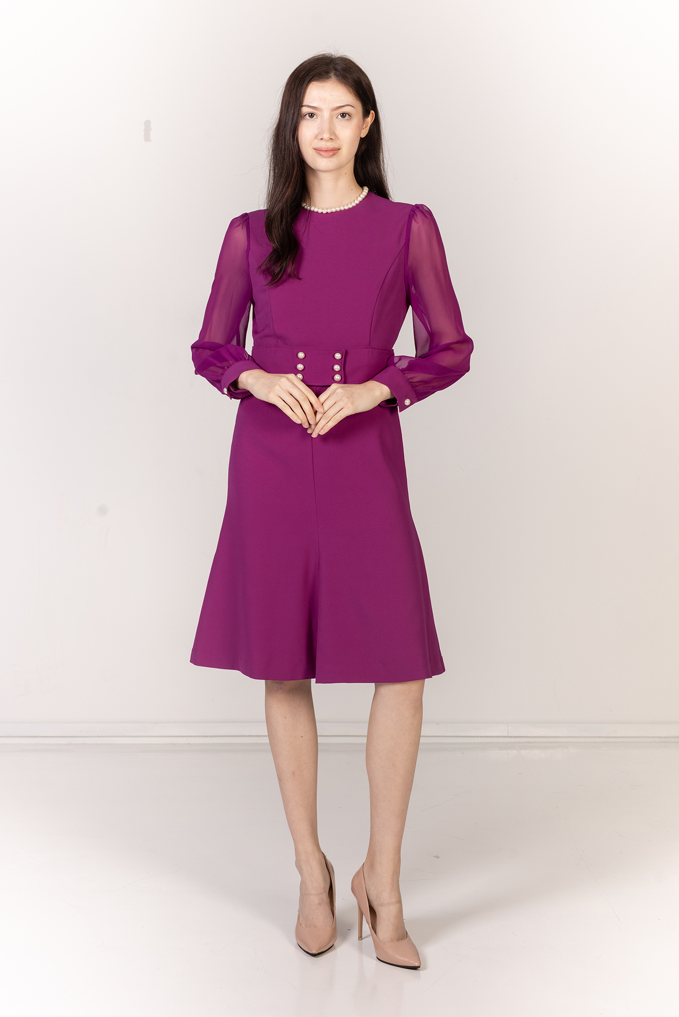 A TASI NEWYORK dress with sheer sleeves, a pearl – trimmed neckline, and a belted waist. The flared hem and elegant design make it suitable for office or special occasions.