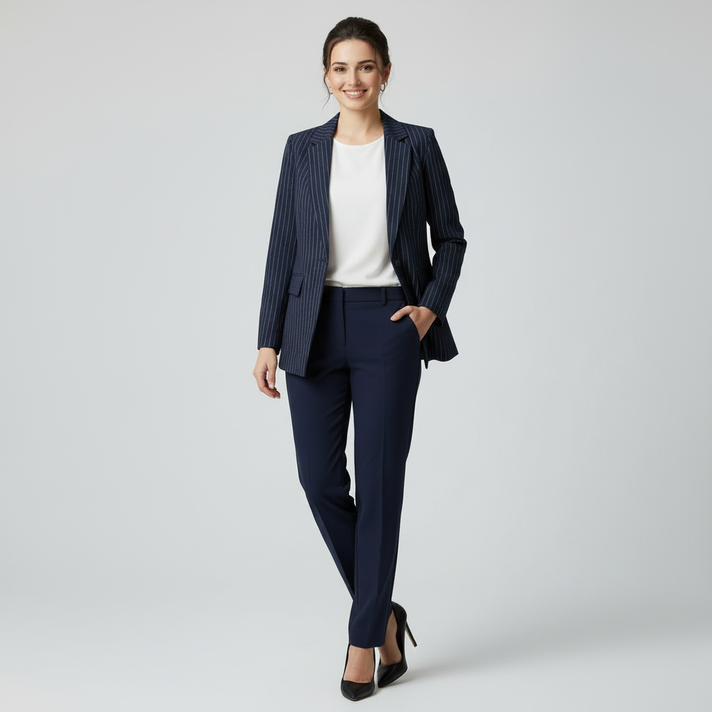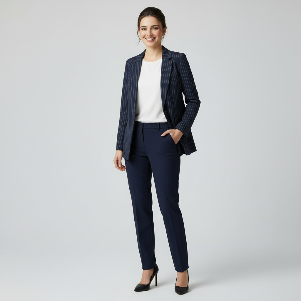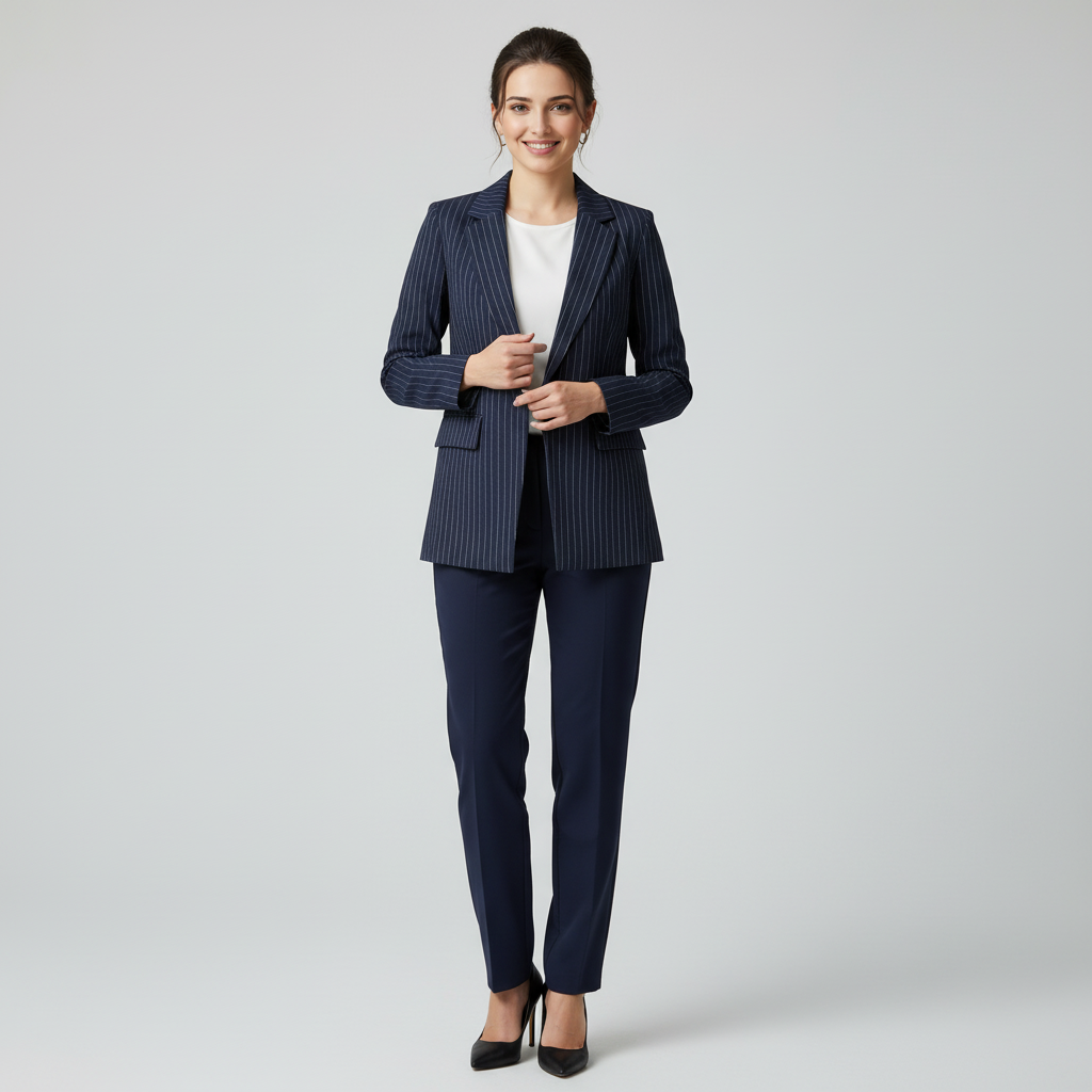 Styling Tip: Pair it with matching navy pinstripe trousers for a complete power suit, or style it over a white silk blouse and high-waisted black skirts for a sophisticated “quiet luxury” office aesthetic.