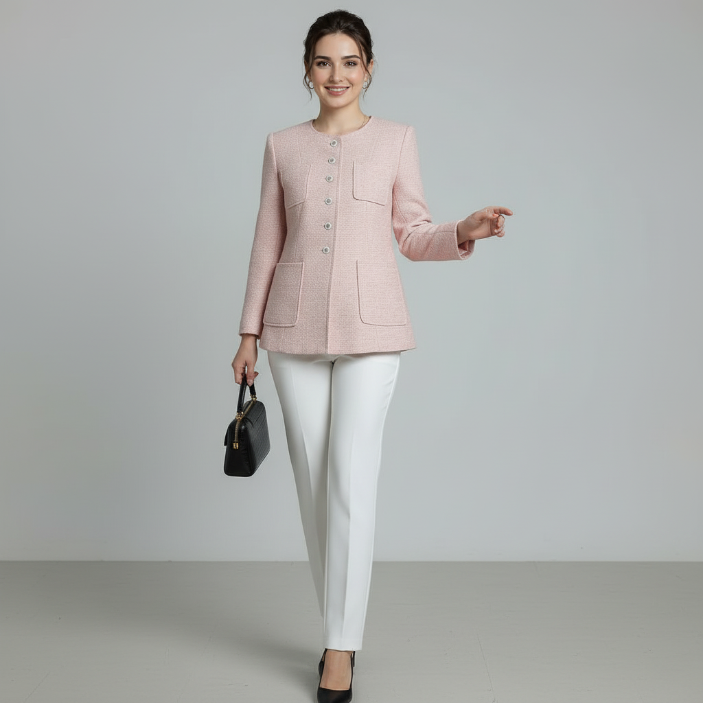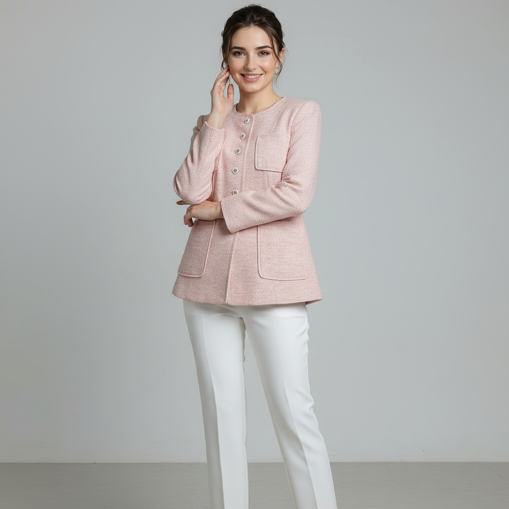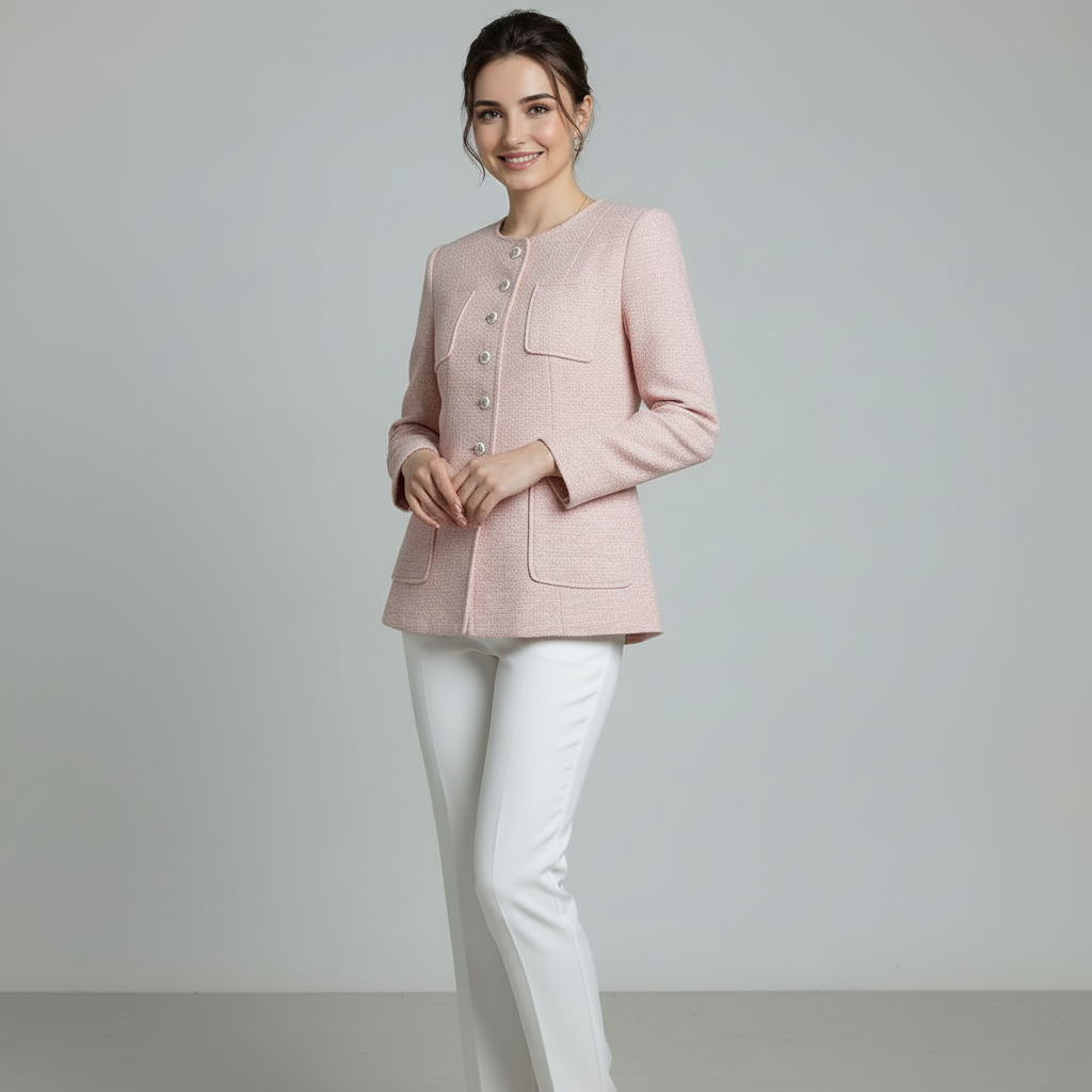 Graceful tailoring meets heritage charm. The Madison Longline Jacket combines a soft peach-and-cream tweed weave with signature pearl buttons and a sophisticated four-pocket design. This Tasi New York essential delivers a structured, “quiet luxury” silhouette with a refined, feminine edge.