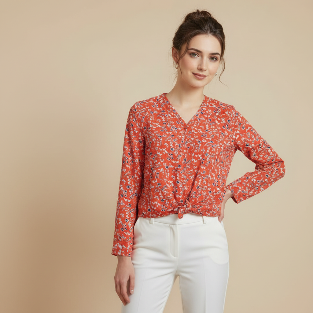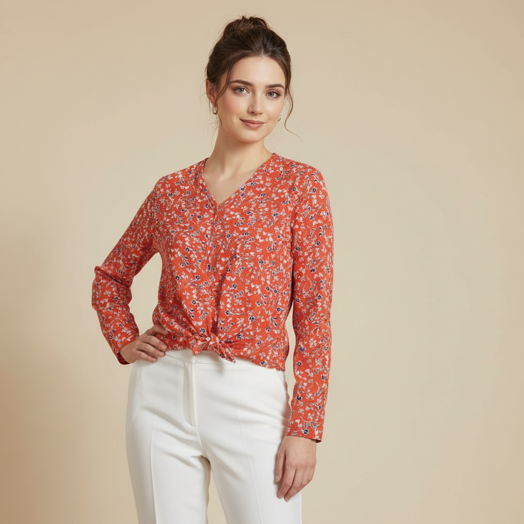 Effortless charm meets a vibrant botanical aesthetic. This Floral Print Blouse is designed to bring a pop of color and personality to your everyday wardrobe. Featuring a delicate orange and white floral motif on a rich red base, it captures a sense of seasonal transition and lighthearted elegance.